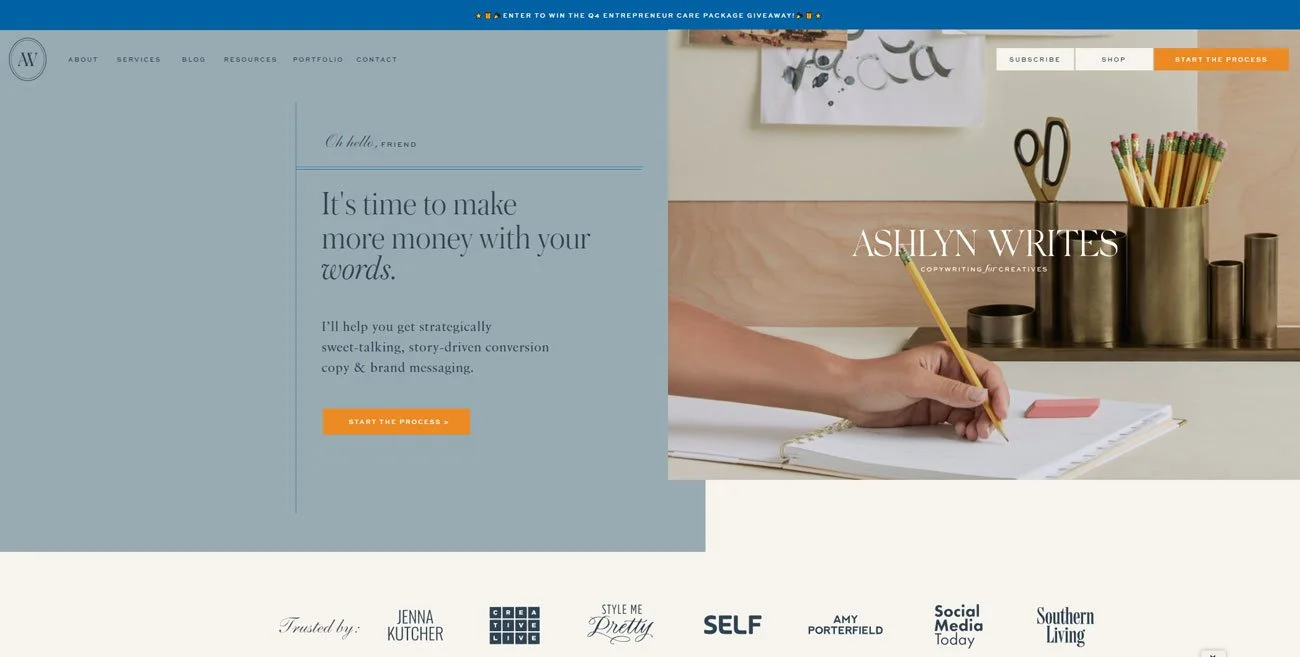 Copywriter Ashlyn Carter’s homepage has a strong headline, CTA, and hero image, along with social proof above the fold. Source | Ashlyn Writes