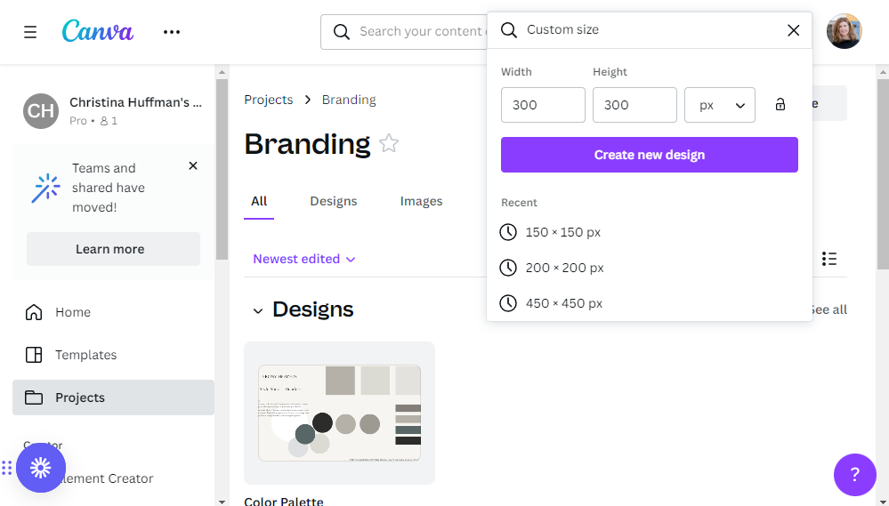 Select “Custom size”, enter 300 x 300 px and “Create new design”