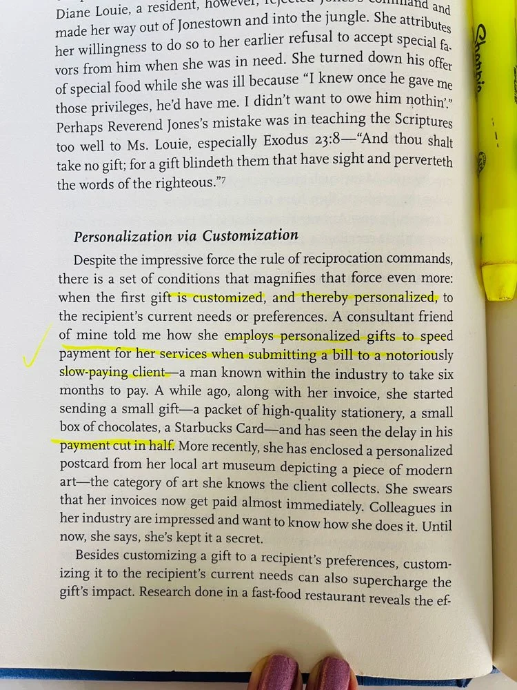 Robert Cialdini’s ‘Influence - The Psychology of Persuasion’ discussing how personalization via customization helps a consultant friend get paid faster when offboarding her clients.